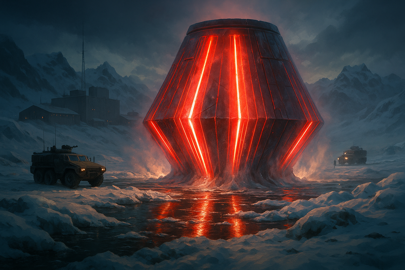 According to The Secret Parchment written by Radu Cinamar, in January 2007, near the American military base Macor in Antarctica, a strange phenomenon shook the international military and scientific community. Beneath a layer of over 200 meters of ice, a colossal device was revealed, shaped like a massive truncated cone, glowing like a cosmic lighthouse. It began to emit powerful luminous pulses, similar to pulsars, creating unease among those witnessing the event.